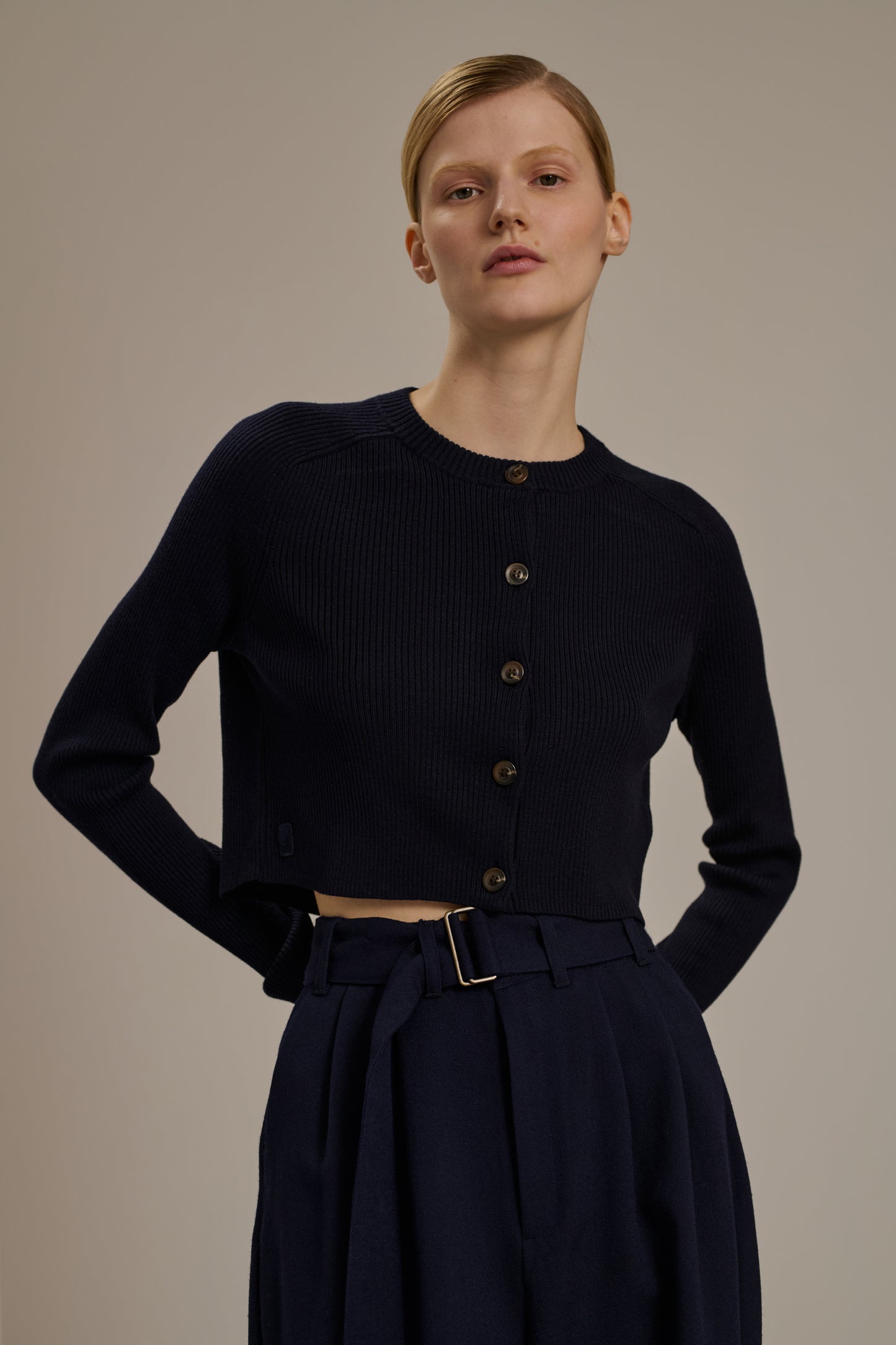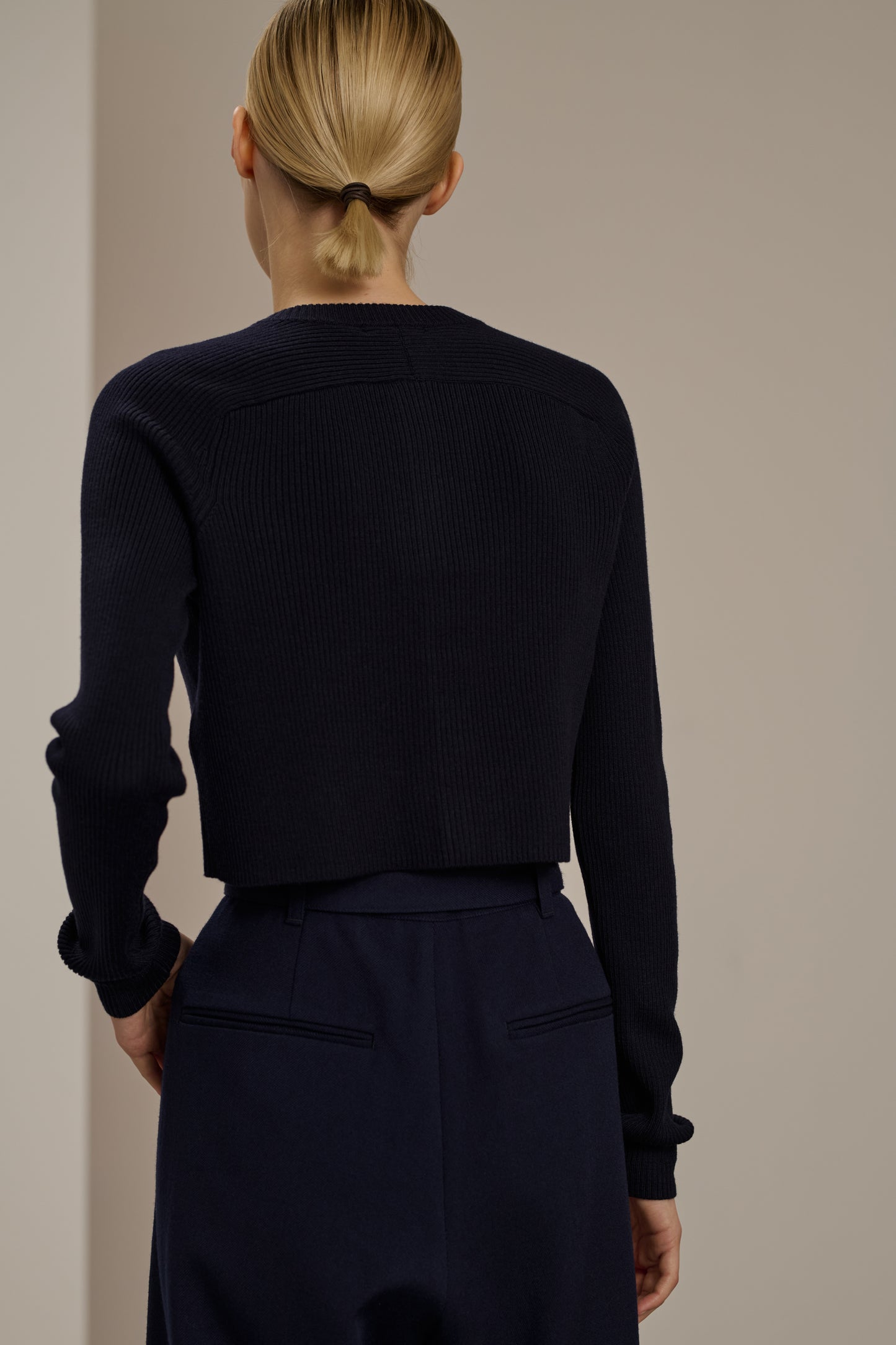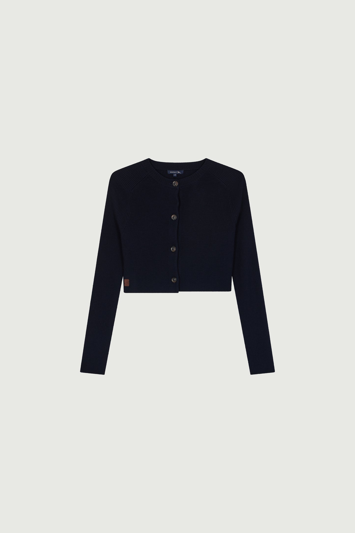 Cardigan court à maille côtelée, en laine mérinos bleu marine.