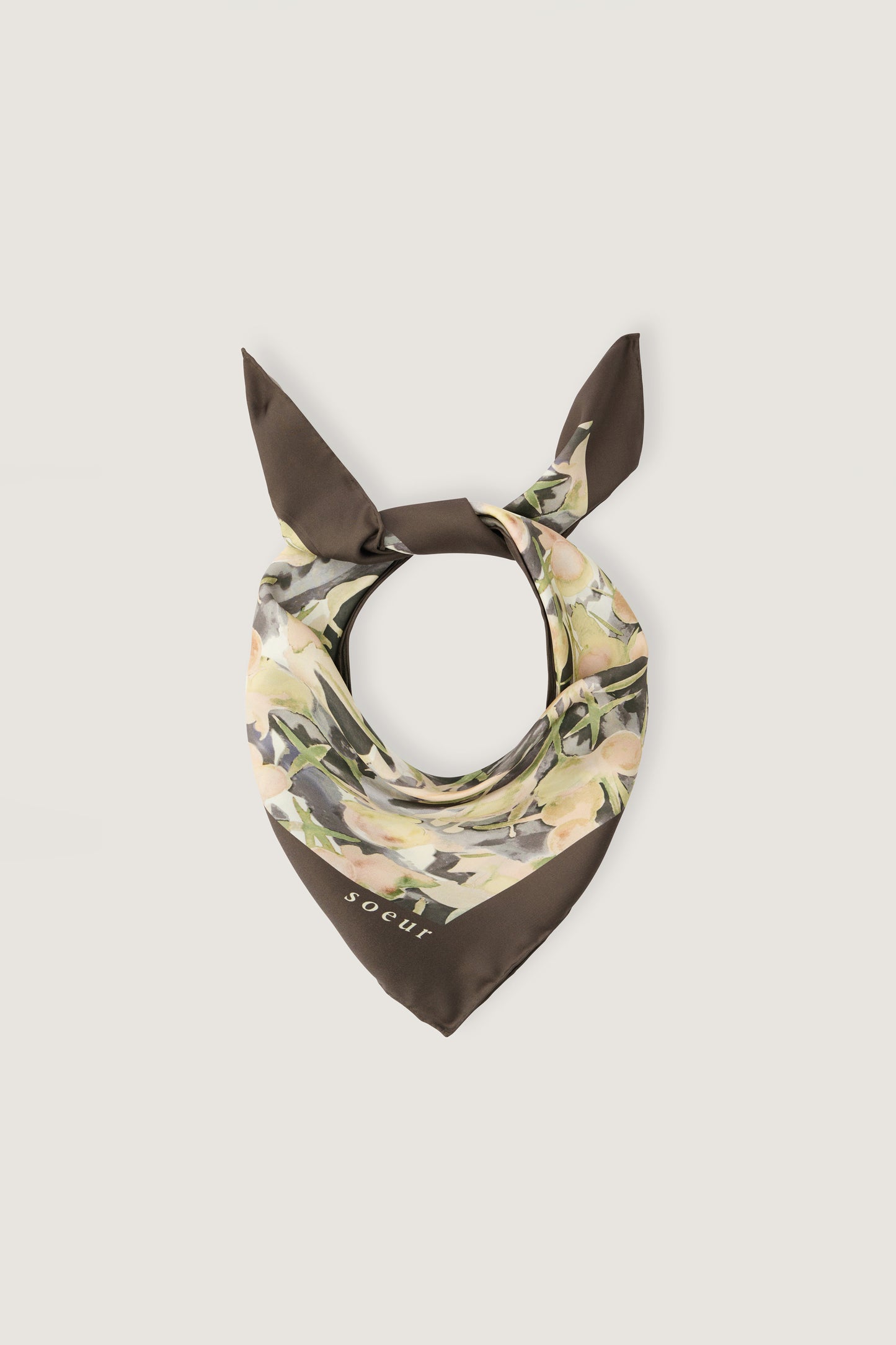CAPUCINE est un foulard en soie imprimée. Signature du vestiaire Soeur, nos carrés en soie apportent une touche d'élégance et de fantaisie à n'importe quelle tenue : noués autour du cou, dépassant discrètement d’un col de chemise ou de pull, noué sur l'anse d’un sac, ou en fichu sur la tête…
