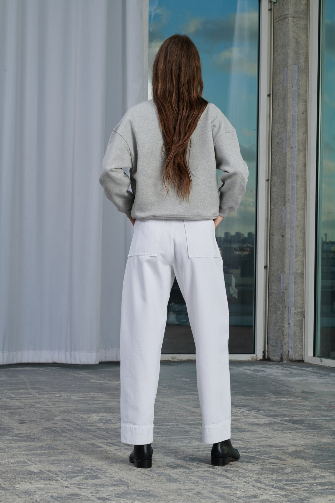VOLAGE est un pantalon à la jambe ronde et large. Sa taille haute est à resserrer grâce à une ceinture large pour l'adapter à toutes les silhouettes. Il est reconnaissable par ses poches à la découpe en biais. La toile de denim est dense, ce qui apporte de la tenue.