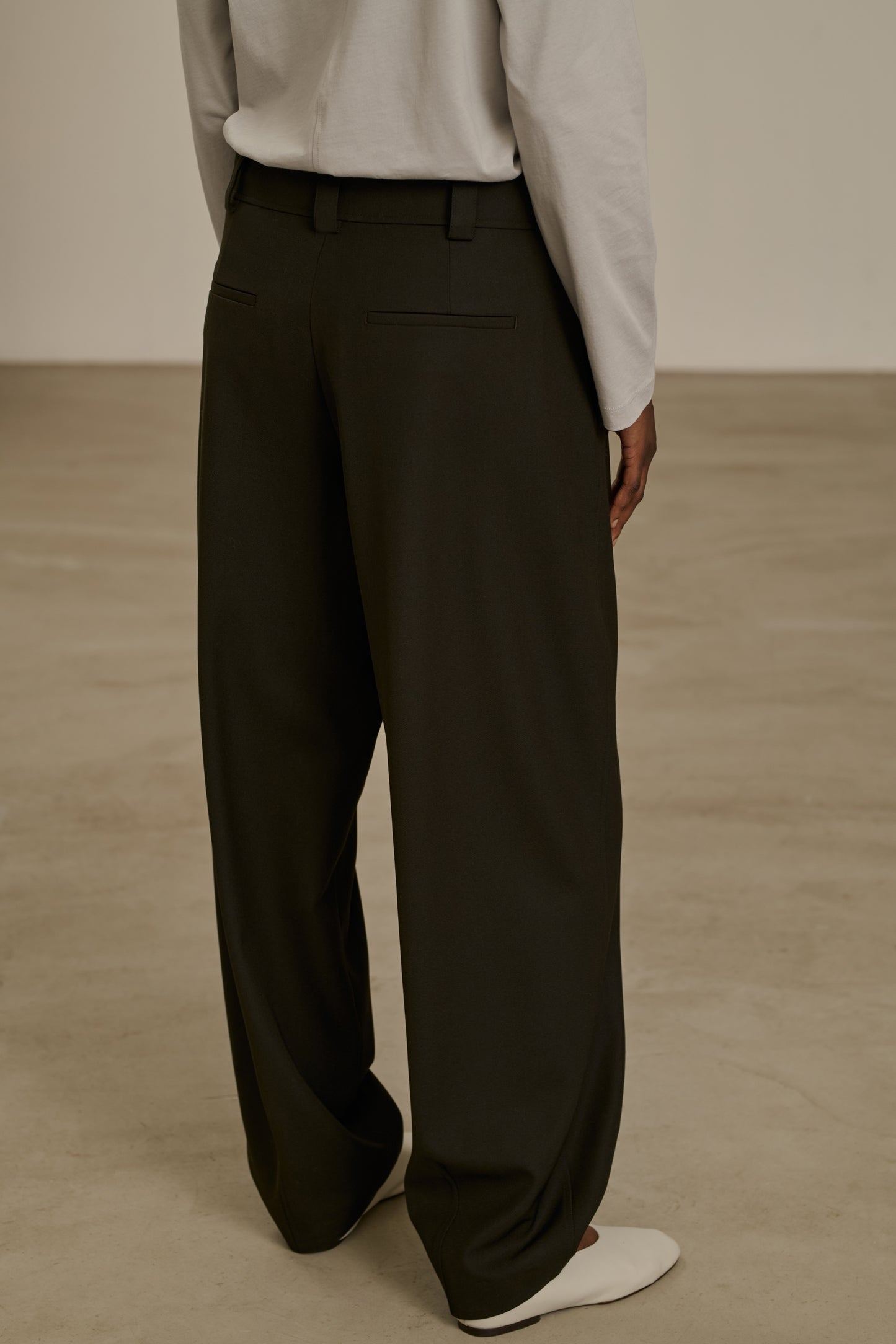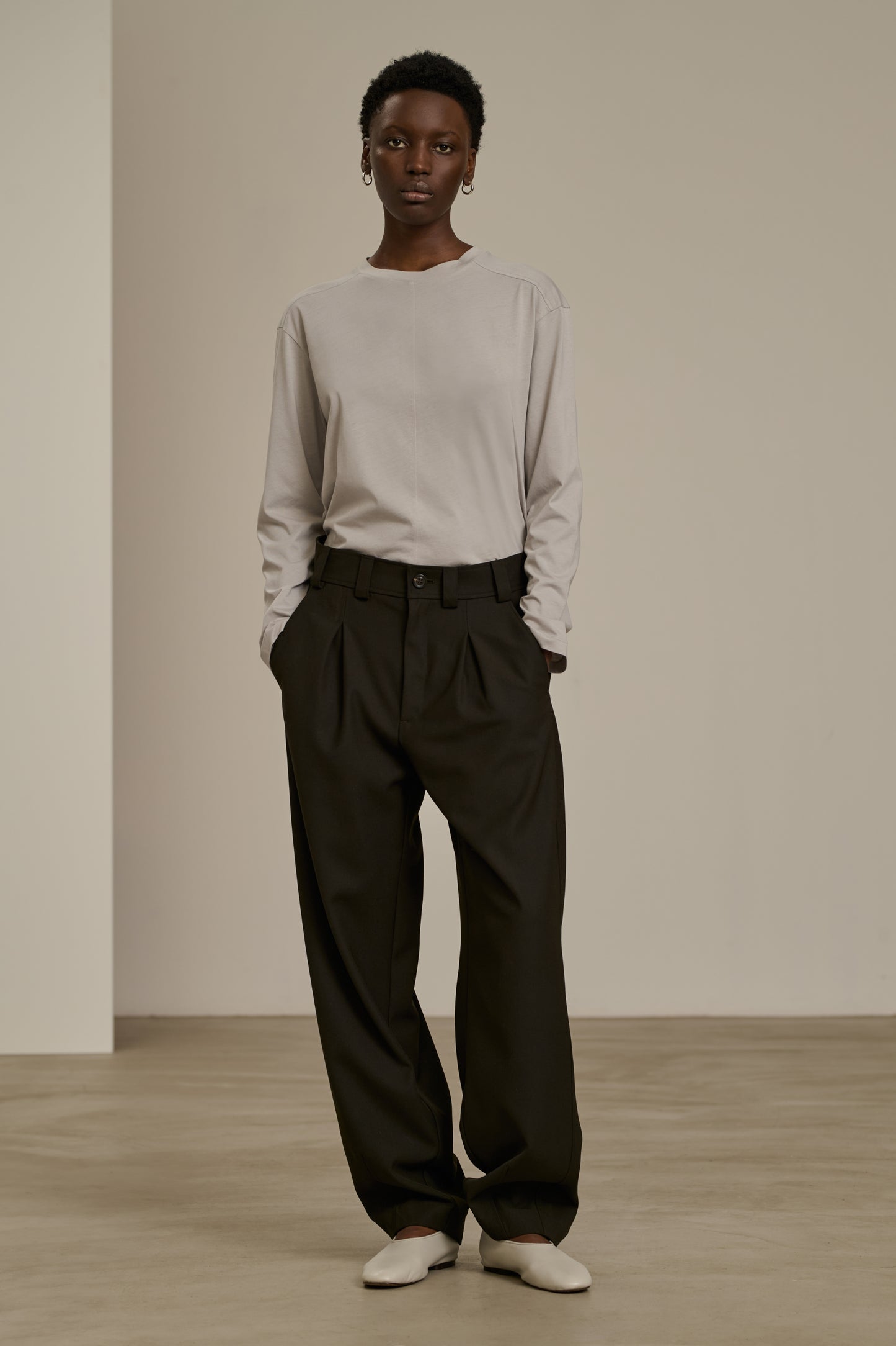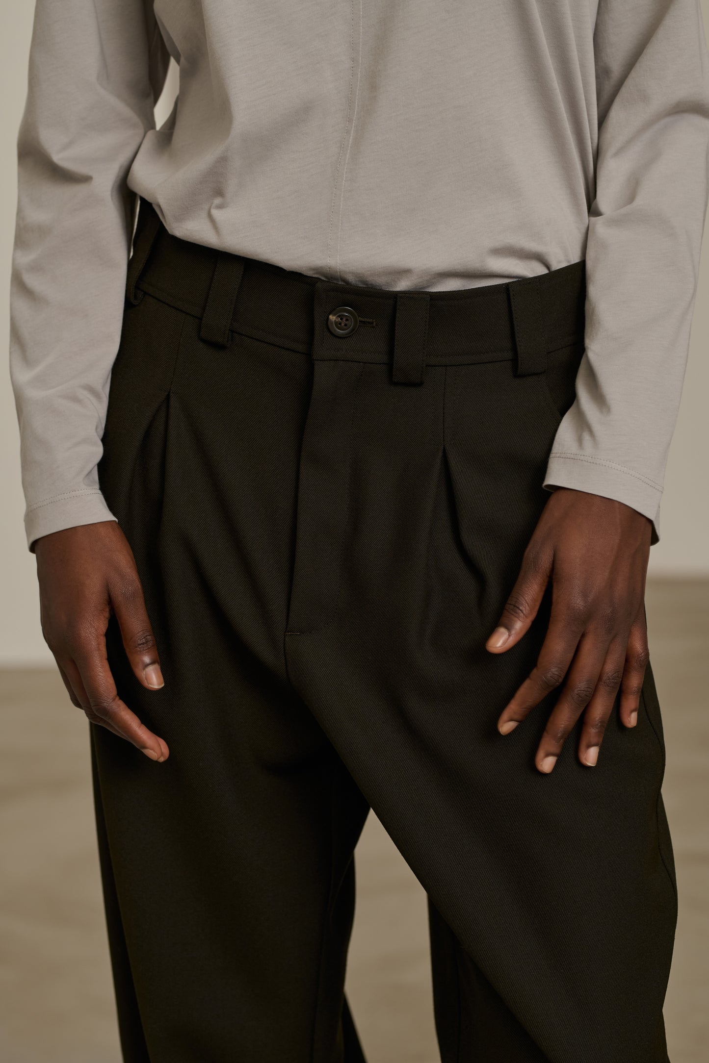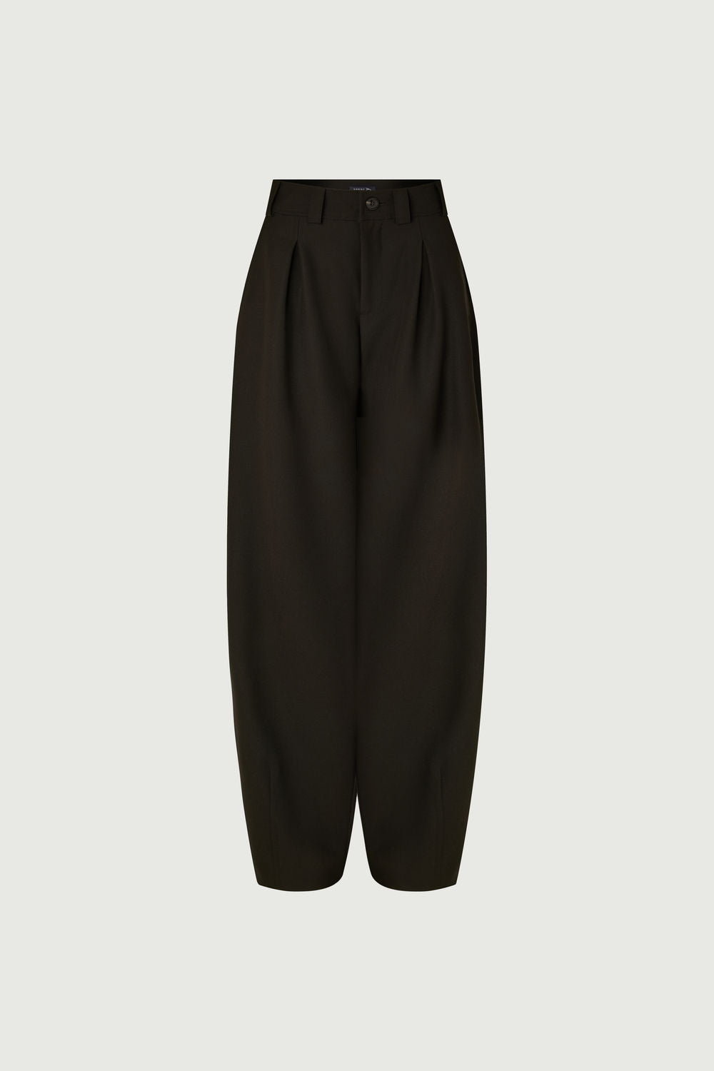TIMON est un pantalon à pinces à porter taille haute ceinturé et blousant, ou taille basse posé sur les hanches. Il crée un effet de volume maîtrisé, allié d'un vestiaire oversize. À assortir au pantalon TIMON pour un total look automnal en gabardine de laine.