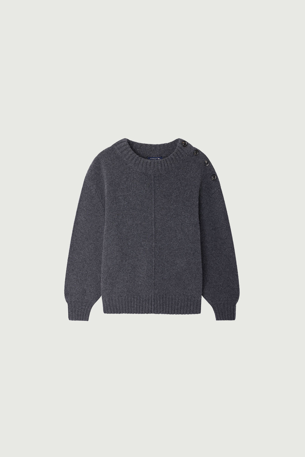 SACHA est un pull à manches longues, tricoté dans un fil de laine mérinos. Sa coupe se caractérise par un effet de rondeur, porté par des emmanchures tombantes et un détail d'ouverture boutonnée le long de l'épaule. Un effet de tricotage visuel apporte une signature subtilement fondue dans le gris anthracite de sa teinte.