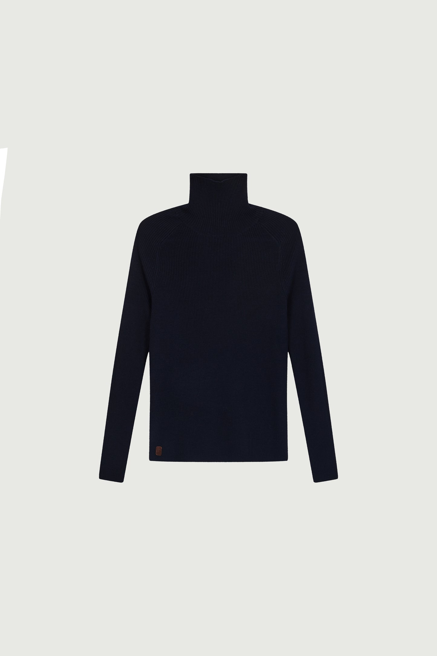 Pull col montant côtelé en laine mérinos bleu marine.